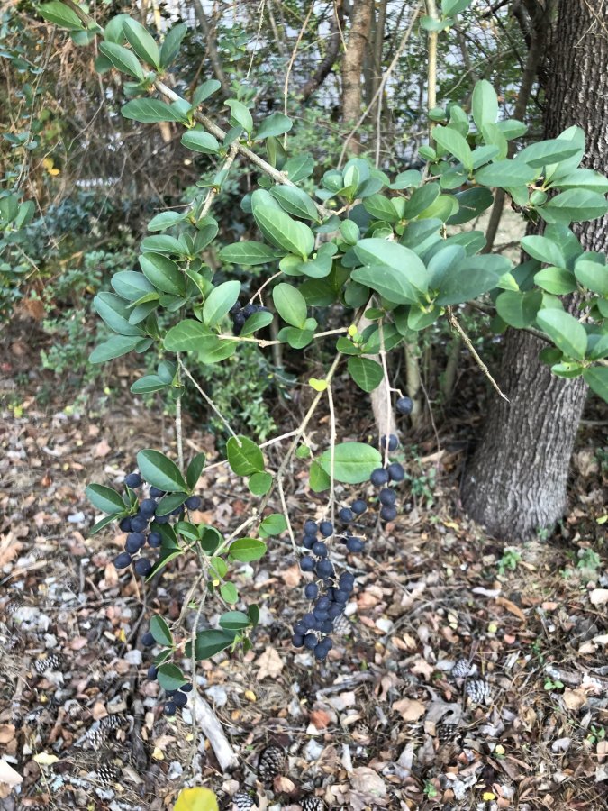 Blue berries , waxy leaf, bush 10Õ tall but has not been maintained. Birds do not seem to eat berries.