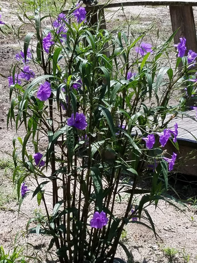 multiple purple flowers, about 3 ft tall, thib pointy green leaves