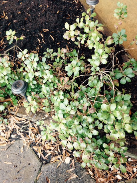Looks like it could be either Pittosporum or Indian Hawthorn to me. Check out the pics and see what you think. Here’s some pics of Pittosporum http://imgkid.com/pittosporum-tobira-tree.shtml Here’s some of Indian Hawthorn.(It’s growth habit is more like the Indian Hawthorn that I have) http://www.lordsnursery.com/store/product.php?productid=16204 They are both used for landscaping around homes and both are evergreen her in the Atl. Hope this is of some help.