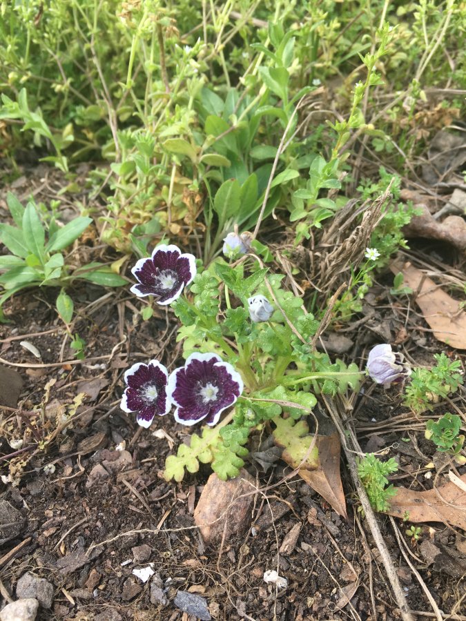 Maybe a cultivar in the Menzies’ baby blue eyes called ‘Penny Black’? Check it out and see if you have a match. Best wishes! https://en.wikipedia.org/wiki/Nemophila_menziesii#/media/File:Nemophilamenziesii-pennyblack.jpg