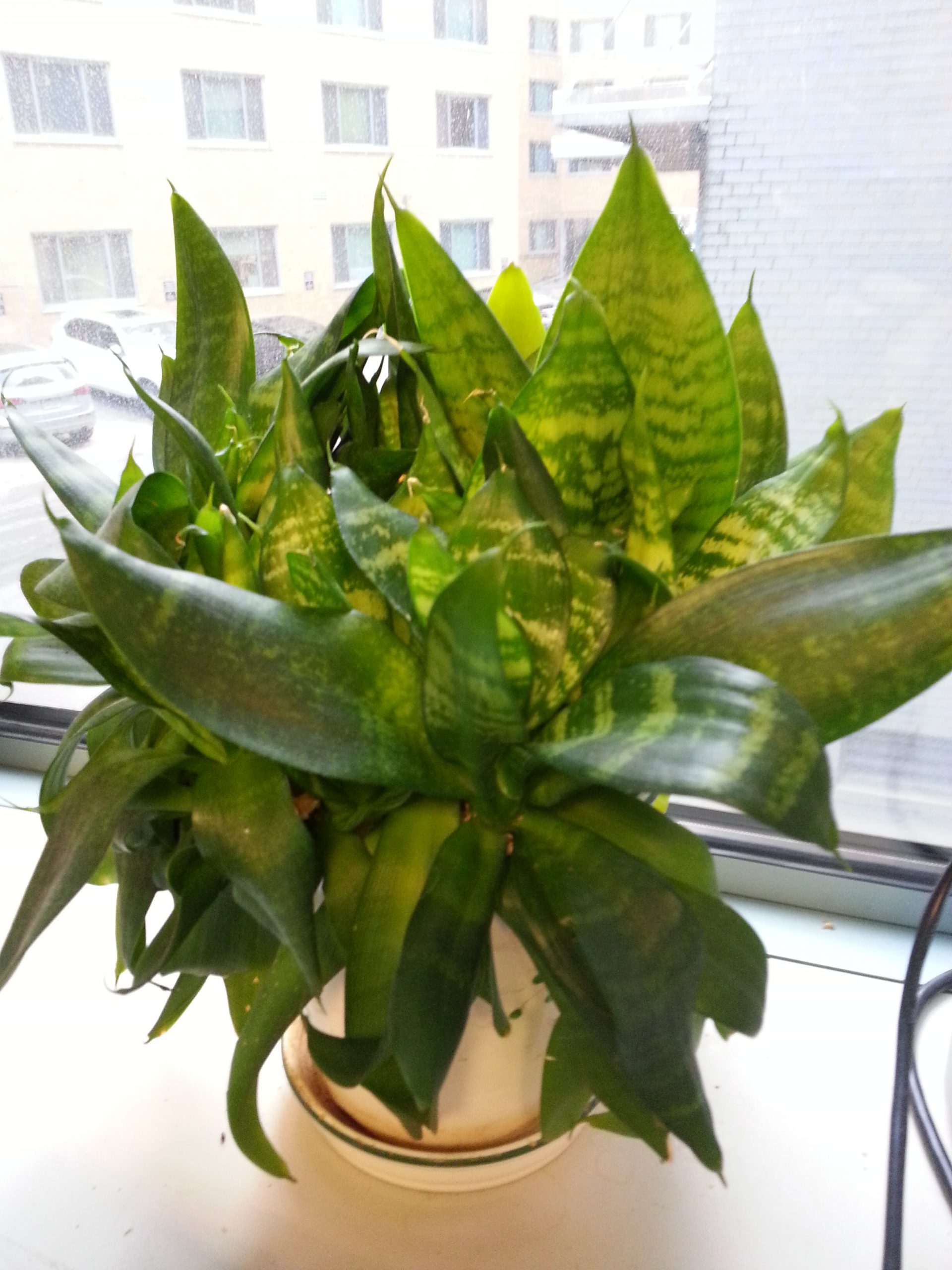 It’s very easy to maintain, clumps together in a small pot, has splotchy horizontal stripes, and narrowish leaves.