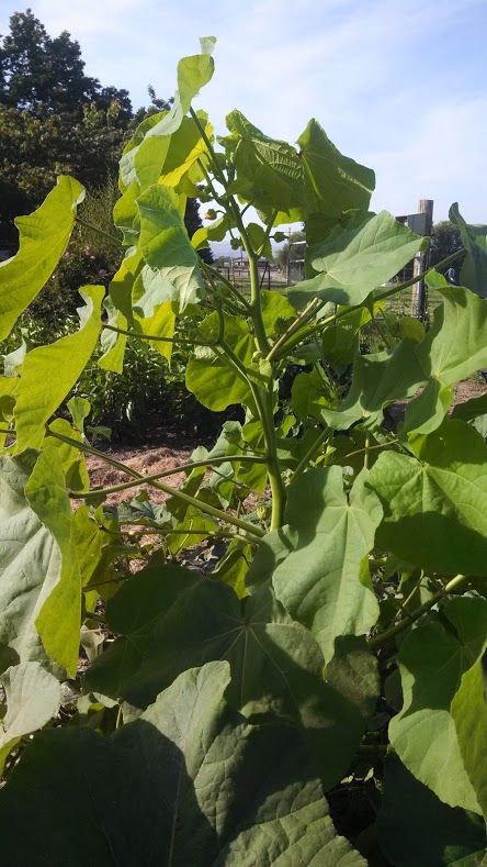 I thought it was a cantaloupe seed. But as it grew it obviously wasn’t. It grew tall, and I thought it might be a sunflower or something similar. However the flowers were small and almost orange, and then the flower turned into a small green fruit with little spikes – although they are soft. Any ideas?