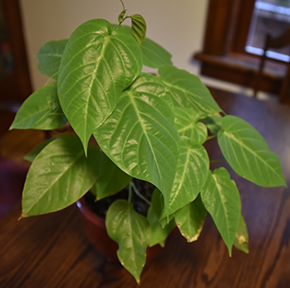 this plant appeared last summer in a pot left with just soil on the porch. It started to look very sad when it got cold, but is thriving indoors.