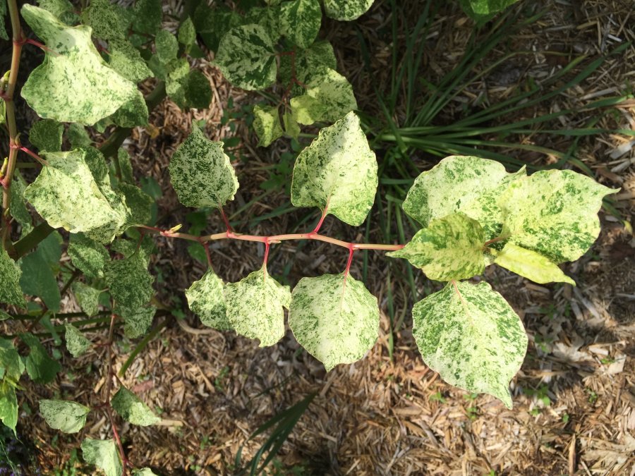 Maybe the variegated form of the Japanese knotweed, Fallopia japonica var. compacta ÔMilk BoyÕ aka Fallopia japonica ‘VariegataÕ? According to sources it is known to revert back to solid green. Link below helpful information. Best wishes! http://techlinenews.com/articles/2014/identifying-ornamental-knotweed-cultivars
