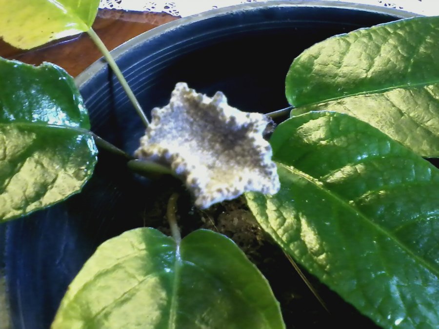 Shade loving, large leaves, very unusual disc-shaped flower.