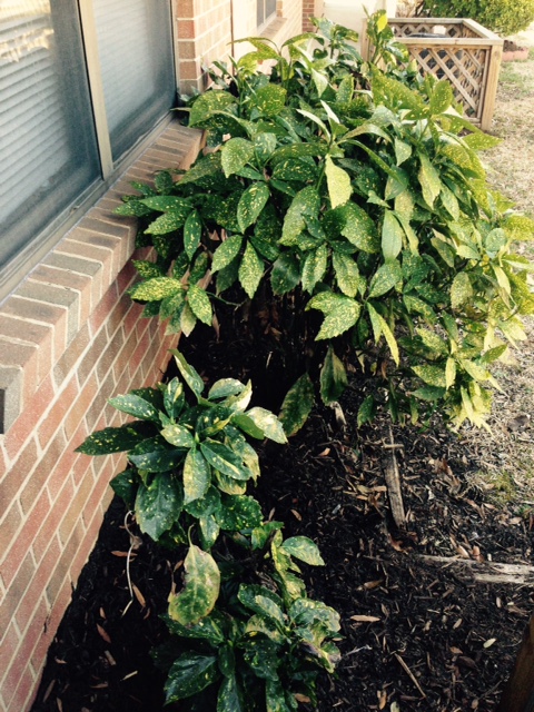 Green with yellow spots all over. Doesn’t lose its leaves during winter.