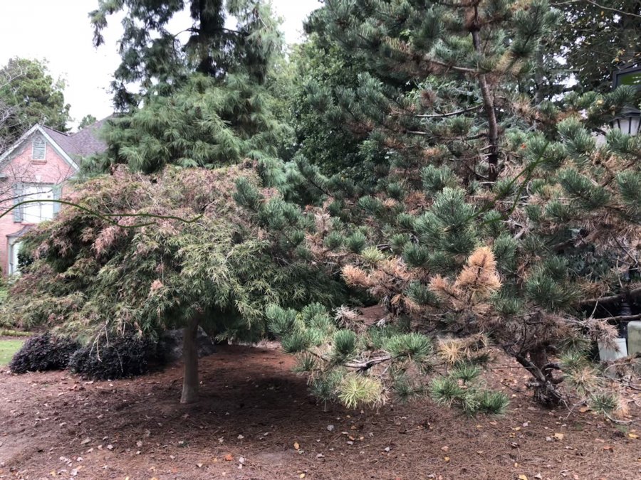 Recently we found one of the tree (See attached picture 1. Looks like a spruce or pine type tree ) develop some kind of problem. Some of the branches turned brownish, attached picture 2. There is a Japanese maple next to this tree and the leaves started to turn brown too.
