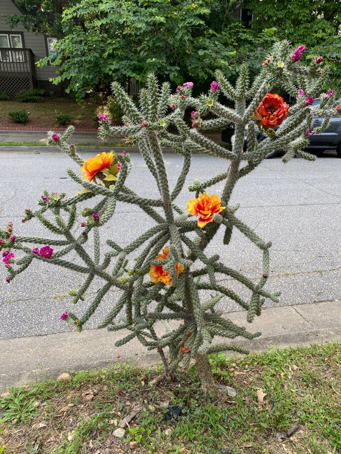 From this distance and with its fruits, I’m guessing a type of chollas (Cylindroptunia)? I can’t tell if this is the sepcies or hybrid. Check out the species C. spinosior (Walkingstick Cactus) from the included link below. click on images to enlarge. Best wishes! http://swbiodiversity.org/seinet/taxa/index.php?taxon=63&clid=3119