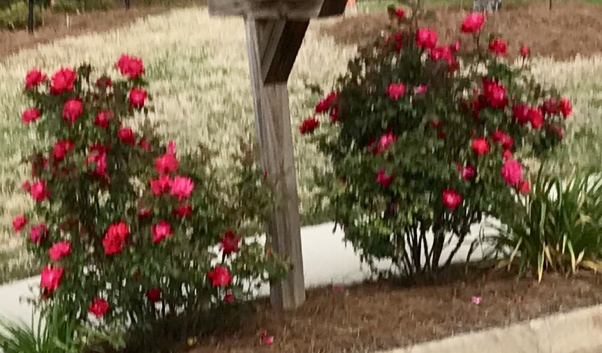 Red and pink flowers, all of the bushes are about the same size and shape.