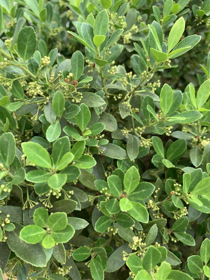 Thank you for these follow up photos. They are great help! To my eyes these leaves & flowers look similar to the soft touch Japanese holly (Ilex crenata) (?), regrettably I can’t tell which cultivar this is. Check out these included link for images of leaves & its flowers. Best wishes! http://chalk.richmond.edu/biology/trees/htmls/ilex_crenata.htm
