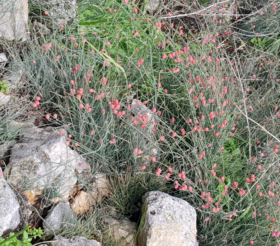This plant grows on our plot among rocks. I never see any flowers or leaves on it, only twiggy stems and then the pink little berries appear. Inside each berry is one single seed. The plant has been appearing in the same spot for decades, and I do not recall seeing it anywhere else.