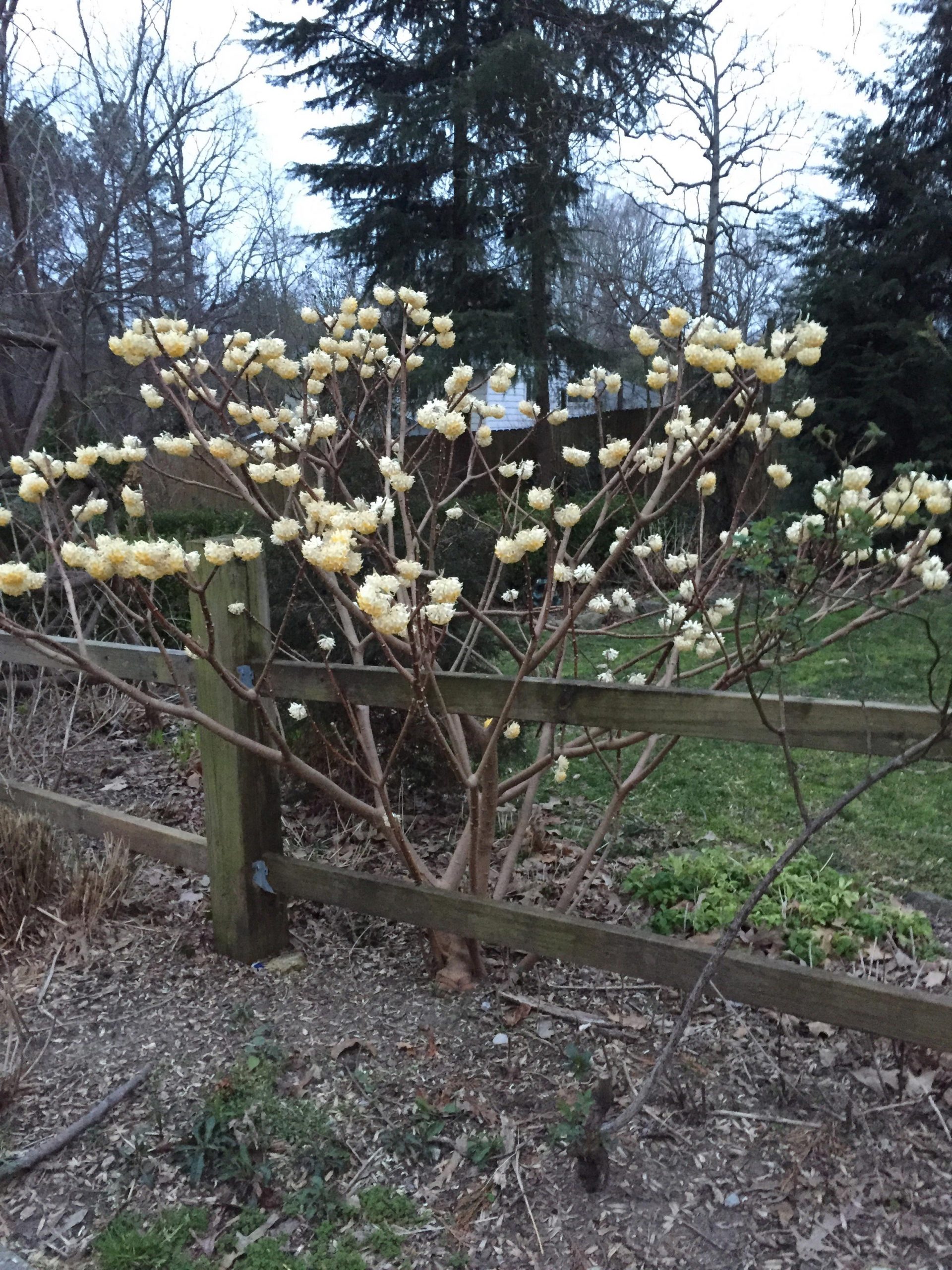 This bush is currently blooming in ga. White blooms that hang down from a single stem. No leaves yet. Each bloom is a cluster of small white flowers.