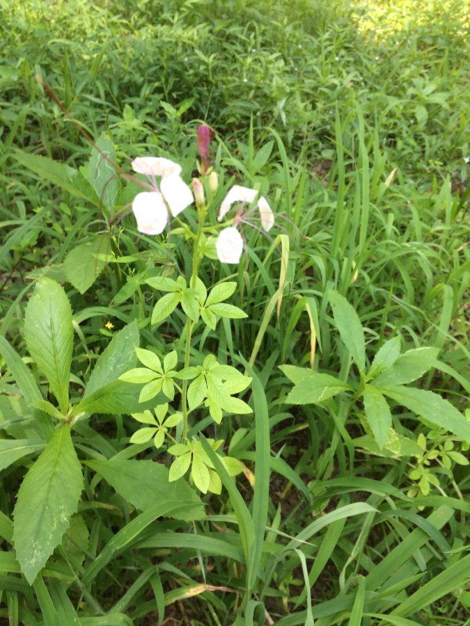 Maybe a species in Cleome genus (spider flower)(?). Sorry, I can’t tell which species this is. Check out the included link below for one of the species in the genus, the Cleome gynandra (spiderwisp). Best wishes! http://www.eattheweeds.com/tag/cleome-gynandra/