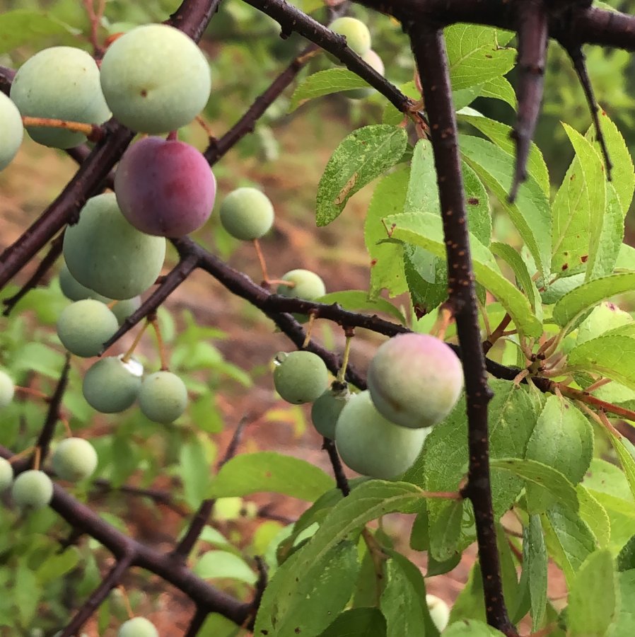 The pictures of the flowers and trunk are from March when I was first trying to figure out what type of tree it was… and now that it has started fruiting, Im really trying to figure out what type of tree it is 🙂 Ive been telling my husband that its a plum tree but would love to know for sure. The fruit is rather tiny and pretty firm right now.