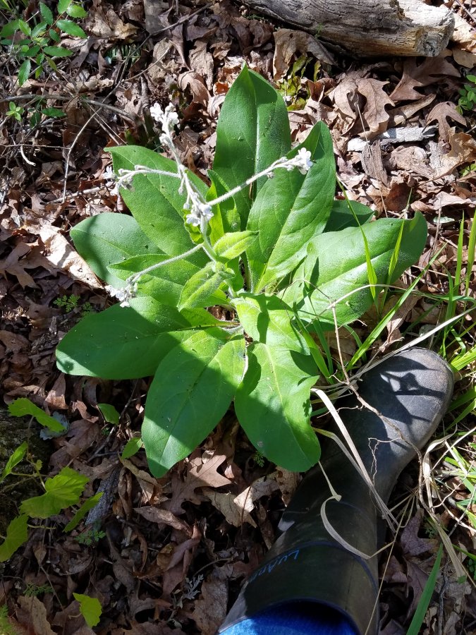 Used my foot for perspective. Smooth leaves at base, probably 10″ across; small, very pale blue flowers atop center stalk approx. 12″ high.
