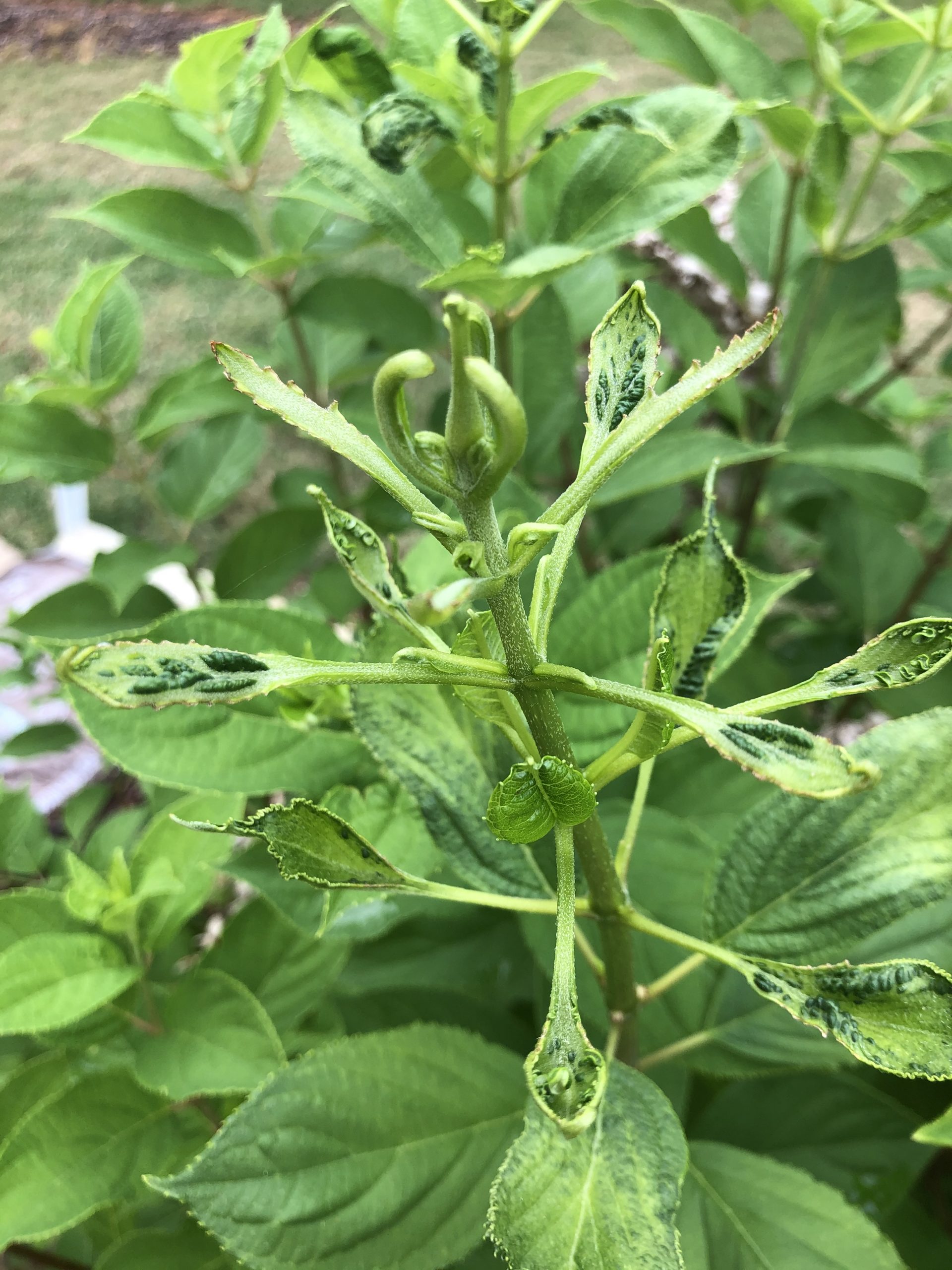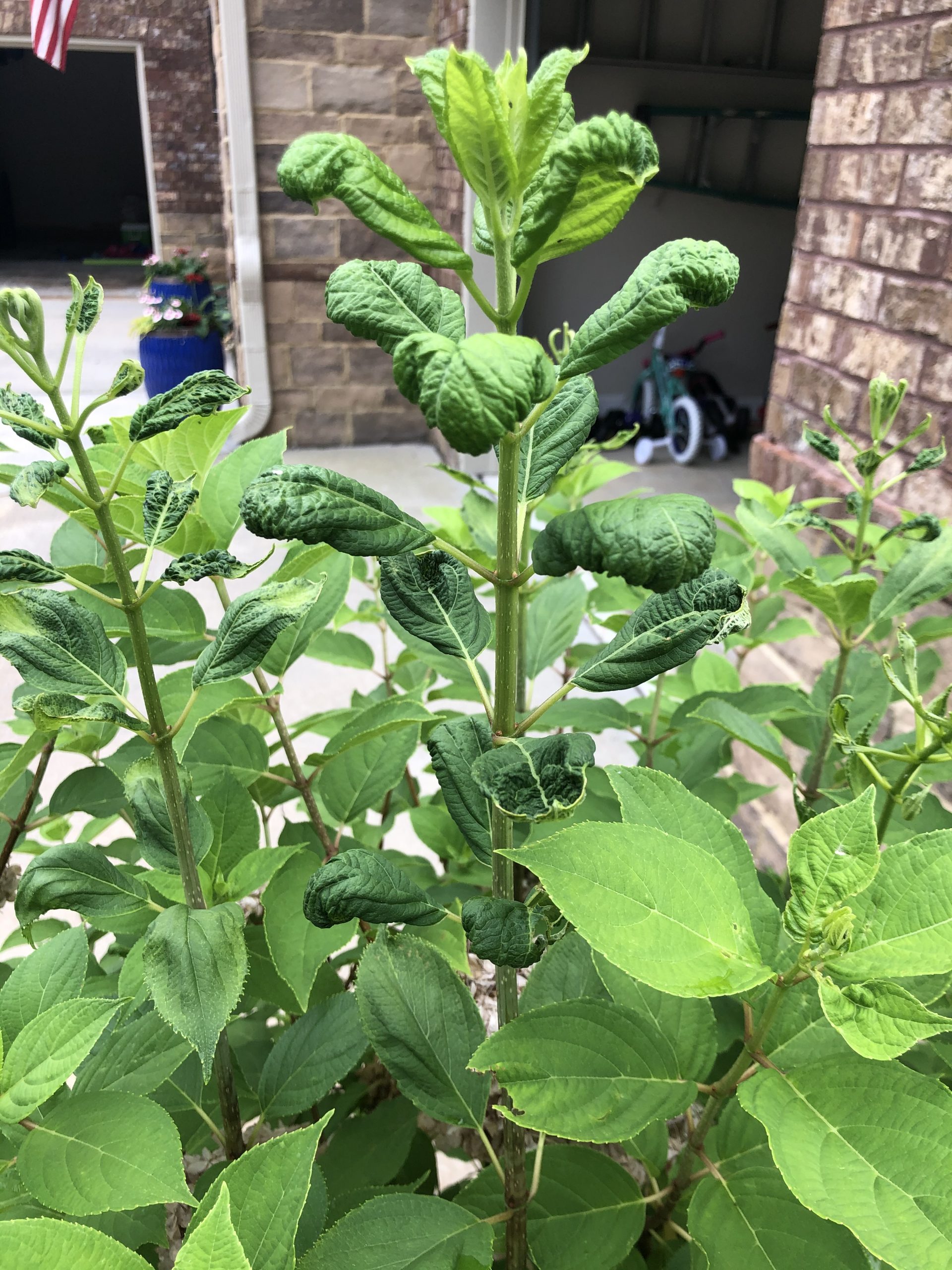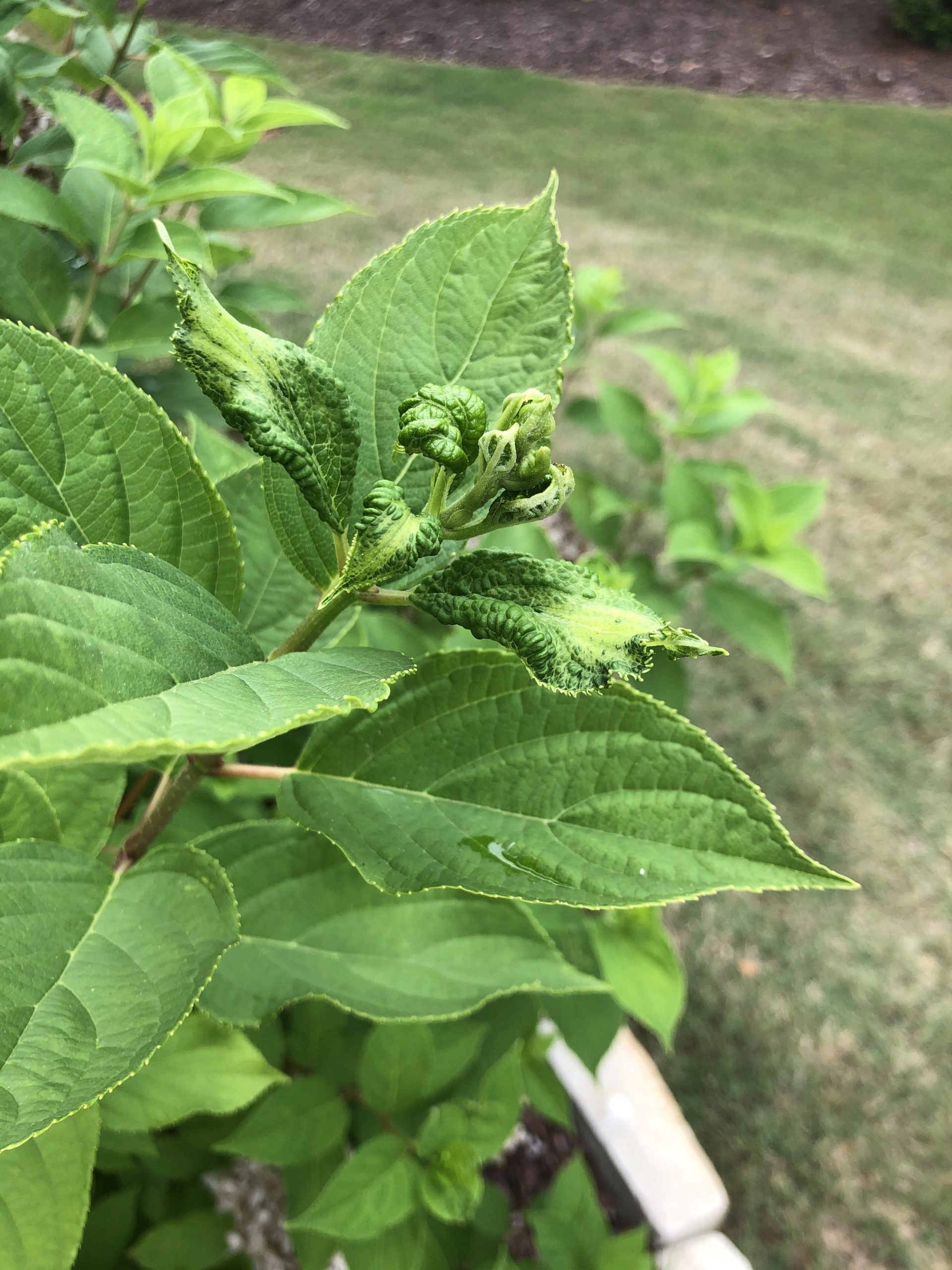 I don’t know what’s the cause of the hydrangea’s malformed leaves & new growth. Check out Walter’s link on Hydrangea’s virus & herbicide drift damages on plants.