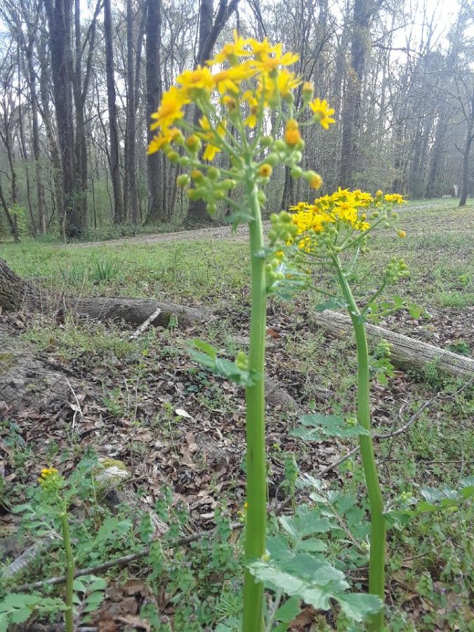 Maybe cressleaf groundsel/butterweed ( Packera glabella syn. Senecio glabellus)? Check it out and see if you have a match. Click on images from the included link below for more information. Best wishes! https://rangeplants.tamu.edu/plant/butterweed/