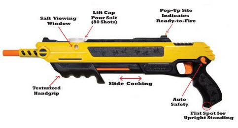 The Bug-a-Salt (click here for sources) is an air gun that uses table salt to kill small insects. (One wag says you can also use it to salt your steak or potatoes!)
